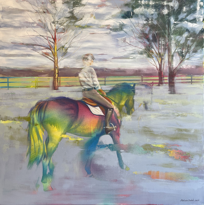 Bu eser, insan ile doğa arasındaki yolculuğu dingin bir zaman aralığında ele alır. At üzerinde ilerleyen figür, hareket hâlinde olmasına rağmen içsel bir duraksamayı temsil eder. Yarı saydam renk katmanları ve yumuşak geçişler, mekânı belirgin olmaktan çıkararak anıyı andıran bir atmosfer yaratır. Doğal peyzaj ile figür arasındaki sınırlar bilinçli olarak silik bırakılmış, böylece beden, hayvan ve çevre tek bir bütün hâline getirilmiştir. Eser; yön bulma, aidiyet ve içsel denge arayışını, sessiz ve şiirsel bir anlatımla izleyiciye sunar.