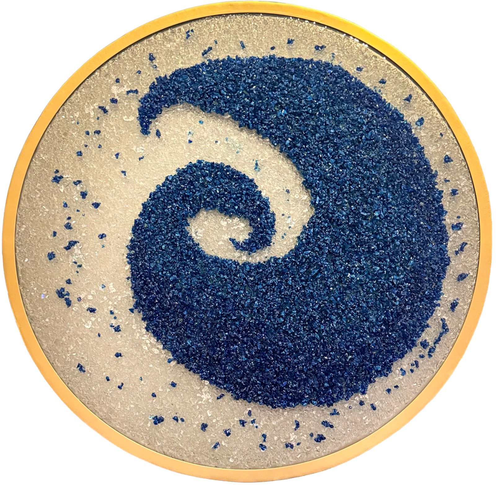 "Dalgadan Doğan" Dalgadan Doğan, başlangıcı ve sonu olmayan bir hareketin içinden beliren varoluş hâlini anlatır. Spiral form, denizin hiç durmadan geri dönen nefesini hatırlatır; her kıvrım, bir öncekinin izini taşırken aynı anda yeni bir yön açar. Bu yüzeyde dalga, yalnızca suyun değil; zamanın, hafızanın ve dönüşümün ritmidir. Koyu mavinin yoğunluğu, derinlikte biriken sessizliği temsil ederken, açık tonlar yüzeye çıkan farkındalık anlarını işaret eder. Merkeze doğru yoğunlaşan spiral, dış dünyanın karmaşasından içsel bir odak noktasına doğru çekilen bir akışı hissettirir. Burada doğuş, ani bir an değil; sabırla biriken hareketin doğal sonucudur.
