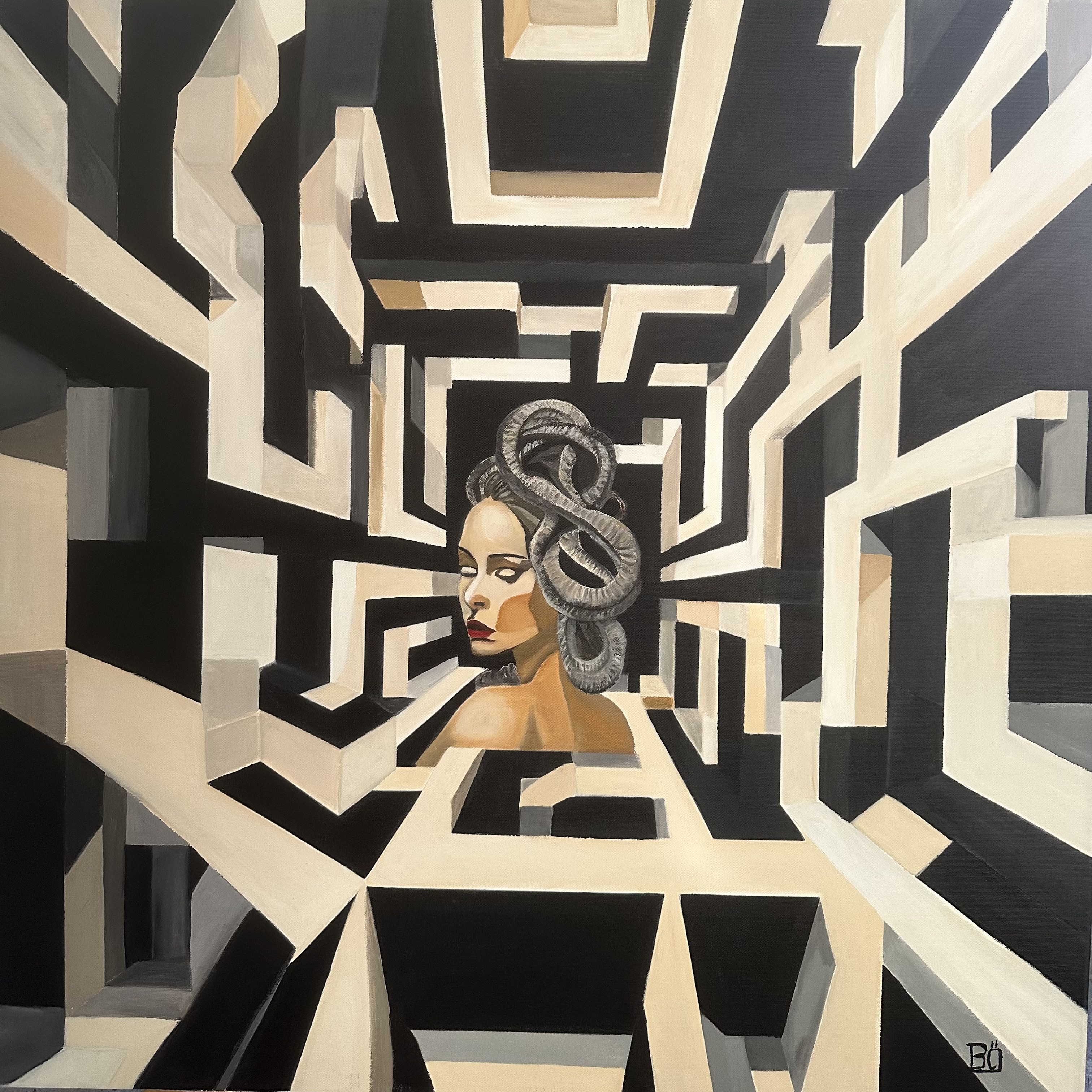 Zihnin Labirentleri serisi, insanın iç dünyasını kaçış, yüzleşme ve yön kaybı ekseninde ele alan kavramsal bir bütün olarak okunur. Geometrik labirent formları, zihnin katmanlı yapısını ve düşüncenin dolaşıklığını simgelerken; figürler bu yapının içinde sıkışmış, arayan ya da direnmeye çalışan özneyi temsil eder. Seride mekân, fiziksel bir alan olmaktan çıkar; bilinç, bellek ve iç çatışmaların sahnesine dönüşür. Labirent, hem koruyucu hem de hapseden bir yapı olarak, insanın kendinden kaçma arzusuyla kendi gerçeğine çarpışını görünür kılar. Mitolojik ve tarihsel göndermeler ise bireysel deneyimi zamansız bir sorguya bağlar: insanın kendini arama hâli. Bu çalışmalar, izleyiciyi bir çıkış vaadine değil, durup düşünmeye davet eder. Çünkü burada asıl mesele labirentten çıkmak değil, onun içinde kalabilme cesaretidir. Bahar Özkaya