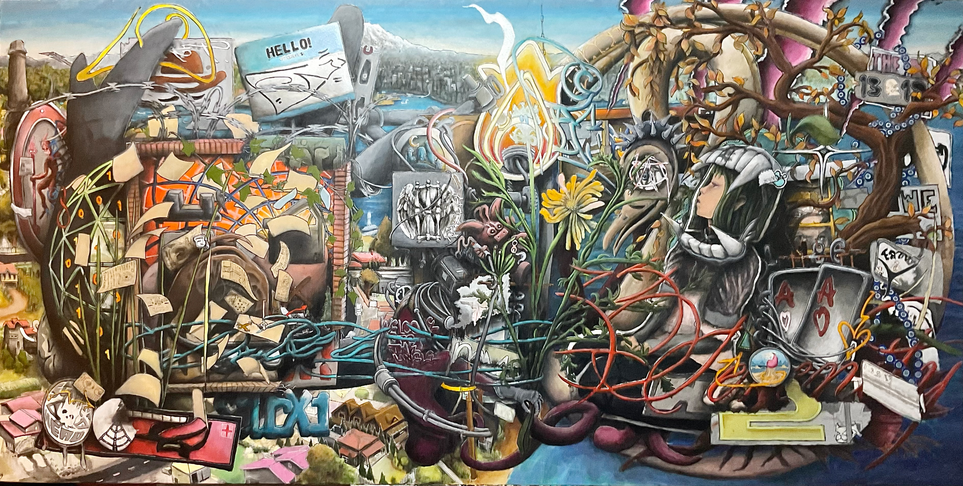 Root Wire, şehri ve çevresini, insan ilişkilerinin şekillendiği duygusal bir arazi olarak keşfeder. Tuval, iki zıt iç dünyaya bölünür; bu, içsel manzaralarının aynı paylaşılan ortamda açıldığı iki bireyi çağrıştırır. Çevresindeki formlar, aralarındaki gerilimlerin, bağların, neşelerin ve çatışmaların sembolik uzantıları olarak ortaya çıkar. Belirli bir hikâye anlatmak yerine, eser soyutlamayı kullanarak somut olayları belirsizleştirir; böylece semboller, sabit anlamdan bağımsız olarak duygusal bir ağırlık taşır. Bu belirsizlik, izleyiciyi kendi deneyimlerini kompozisyon üzerine yansıtmaya davet eder; yakınlık, mesafe, aşk ve sürtüşme anılarına dair kişisel hatıraları harekete geçirir. Sonuçta, resim çevreyi ve insan duygusunu ayrılmaz bir bütün olarak çerçeveler—mekânı, geçici ama biçimlendirici anların hem tanığı hem kaydedeni olarak konumlandırır; kişisel ilişkiler ile insan zihninin arketipsel akımları görünür biçimde iç içe geçer. ingilizce: This work explores the city and the suburban outskirts as it shapes the visual background of relationships between people that inhabit it, but emerges with a visual twist to bind together the inner life and thematic emotions as they appear in relationships on the same topography as the environments in which these feelings are felt. The opposing sides of the canvas differentiate into two people represented by the composition of their own inner worlds. Everything else that takes space across the canvas, appears to have sprung out as symbols from the joys and conflicts of the relationship between the two sides. Both in the efforts to understand each other, and inescapably in the journey to understand their own. Each visual element holds up a certain feeling, but the graphic range of abstraction veils over any visible specified story of the real events lived between the two. The symbols hint at the worlds tucked away behind them, but invites the viewer to initiate that world from their own constructs for what they get reminded of on the natural basis of human relationships at its whole. .The inner world integrated to the wider environment through material means, as if there were a possibility to see in front of ourselves as one big show; all the emotions we feel about our intimately loved and particularly disliked people in our lives, as well as all other lives which we are a part of that bridge between the two. In a final re-phrase; the environment is visualized as inseparably tied to the human; as the conveyor and recorder of those seemingly perishable moments between people we love and not, of the sense of joy or that of danger, and to that of the complexity in the interests of love, conflicts, and the thematic flow of archetypes of the human mind that bind the two.