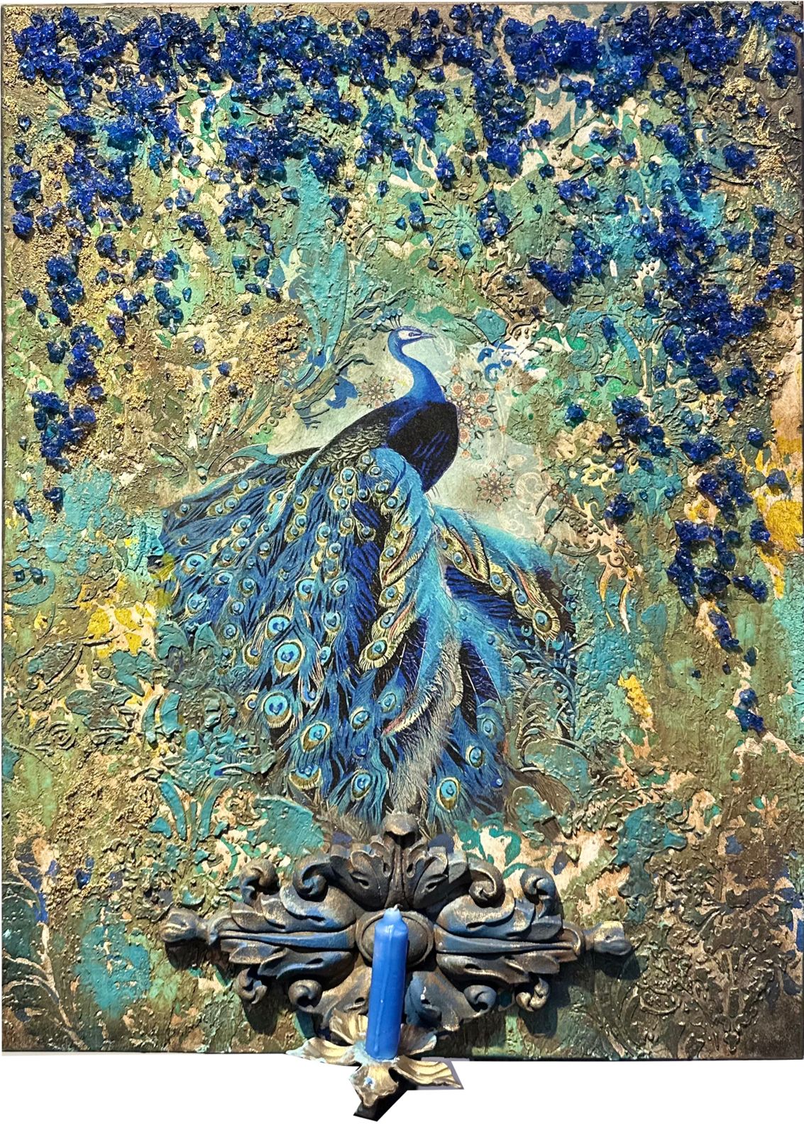 Eser; tavus kuşunun zarafeti ve görkemini vurgularken, hem görsel hareketi hem de doğadaki sürekli döngüleri ifade ediyor. Renkler ve dokuların oluşturduğu bu zengin kompozisyon, adeta bir meditasyona davet eden, derin ve sonsuz bir dansı çağrıştırıyor. “Sonsuzluğun Dansı”, tavus kuşunun kuyruk tüylerindeki detaylardan ilham alarak, yaşamın döngüselliğini ve ruhun ölümsüzlüğünü simgeliyor. Eserin altın ve mavi tonları, gökyüzü ile yeryüzü arasındaki bağlantıyı, sonsuzluğun ve bilincin derin katmanlarını yansıtıyor. Tavus kuşunun süzülüşü, özgürlük ve güzelliği kutlarken, hepimizi içsel yolculuğumuza çıkmaya davet ediyor. Eserin merkezinde yer alan mum detayı ise, bu yolculuğun bir ışık kaynağı ile aydınlatıldığını ve bilinçli bir farkındalık sürecini simgeliyor.