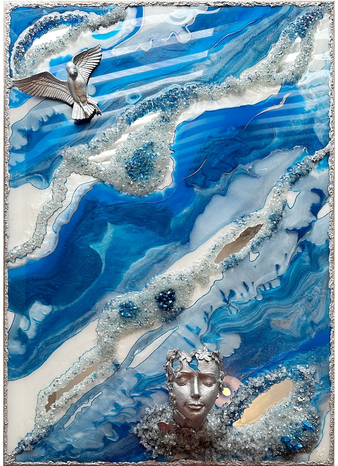 “Suyun Dansı”, suyun içinde saklı olan yaşamın ve ruhun özgürleşme dansını gözler önüne seriyor. Mavi ve beyaz tonların zarif hareketi, suyun akışkan doğasını ve doğanın sürekli yenilenme gücünü simgelerken, her bir dalga insan ruhunun derinliklerinde yankılanan bir hikâyeyi anlatıyor. Eserdeki gümüş yüz, geçmişin ağırlıklarından sıyrılmış, yeniden doğmuş bir bilinci simgeler. Suyun derinliklerinden yüzeye doğru yükselen bu figür, insanın kendi içsel mücadelelerinden zaferle çıkışını ve yaşamın saflığını yeniden kucaklayışını ifade eder. Kuş figürü ise, özgürlüğü ve bu arınmış ruhun artık sınırsız olasılıklarla dolu bir geleceğe yönelme isteğini simgeler. Tıpkı suyun akışı gibi, kuş da sınırsız bir özgürlük içinde süzülür ve hayatın akışına uyum sağlar. “Suyun Dansı”, yaşamın akışına teslim olmaya, içsel özgürlüğünü bulmaya davet eder. Bu eser, yalnızca suyun fiziksel güzelliğini değil, aynı zamanda ruhsal dönüşümü ve yeniden doğuşu da yansıtan bir metafordur.