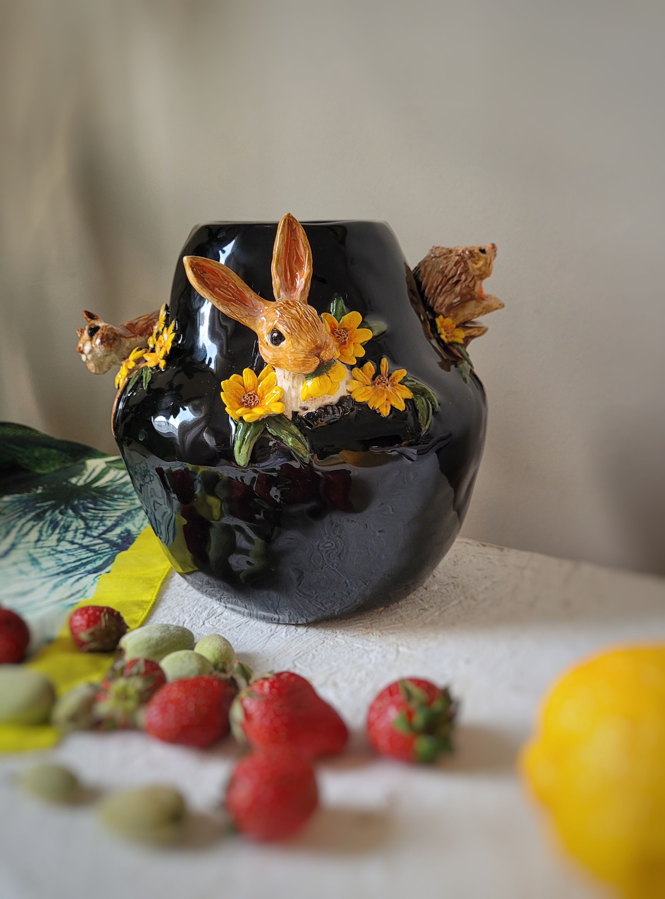 Ormanın derinliklerinde, ay ışığının yere dokunduğu, rüzgârın yapraklarla fısıldaştığı bir gecede… Sessizlik vardı ama cansız değildi; içinde binlerce küçük hayatın nefesi duyuluyordu. O gece, gölgeler arasında üç küçük dost bir araya geldi: Meraklı bir sincap, ürkek bir tavşan ve ağırbaşlı bir kirpi. Onlar konuşmazdı, ama birbirlerini anlardı. Rüzgâr estiğinde sincap kuyruğunu sallardı, tavşan kulaklarını dikerdi, kirpi hafifçe içe çekilirdi. Bu, onların diliydi. Siyah bir zemin gibi uzanan gece, her birini görünmez kılıyor ama aynı zamanda saklı bir bağ kuruyordu aralarında. Gecenin içindeki bu buluşma, doğanın en sakin ânını temsil ediyordu – bir tehdit yoktu, bir kaçış gereği yoktu, sadece varoluş vardı. Sessiz, dingin, saf. Bir usta seramikçi, bir gece rüyasında bu üç dostu gördü. Uyandığında onları unutmamıştı. Onların sessizliğini, uyumunu ve gecenin o derin duygusunu siyah bir vazonun üzerine işledi. Parlak siyah zemin, geceyi simgeliyordu; sincap, tavşan ve kirpi ise o sessizliğin içindeki yaşamın ta kendisiydi. İşte bu yüzden, bu vazonun adı: Gecenin Sessizliği. Bir buluşmanın, bir anlayışın ve söze gerek kalmayan bir dostluğun zamansız anısı.